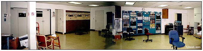 Out of frame to the left is the engineering office (complete, we're pleased to note, with a Tower Site Calendar hanging on the wall); to the right is the bathroom and an entrance to the back rooms that wrap around the main transmitter room.