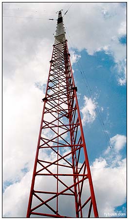 It's rather a long walk back into the field behind the transmitter building to reach the big tower, but it's well worth it just to gaze up this venerable Blaw-Knox stick (yes, they built standard guyed towers in addition to the distinctive diamond-shaped towers) and to think about all the amazing radio that emanated from this piece of steel over the many years of "Musicradio 89" and the many formats that came before and after.