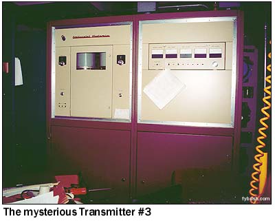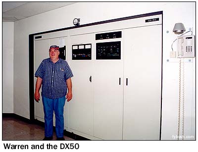 At the left of the panorama (and above, with CE Warren Shulz posing in front) is the current main transmitter, a Harris DX50. Next to that is a Continental 317C3, in active use as a backup transmitter.