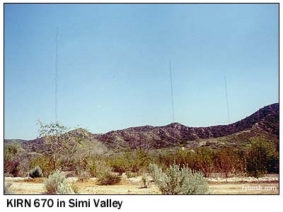KIRN's three-tower site, up Tapo Canyon Road a few miles north of Simi Valley, may soon be supplanted by an even more powerful facility. A few years ago, KIRN negotiated an interference agreement with the big 670 signal out west, KBOI Boise, that resulted in KBOI reworking its nighttime signal to put a null towards Southern California. That opened the way for a CP for 35 kilowatts day and night from a six-tower array up west of Lancaster, about 20 miles and a mountain range more distant from Los Angeles in a pretty barren part of the high desert. (It also cleared the way for a new 670 signal in Las Vegas, eventually.)