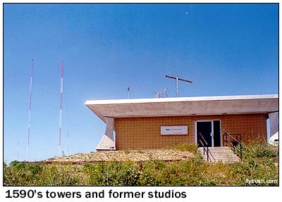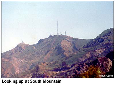Stand in the 1400 driveway and turn around, facing south across the 118, and you can just make out a hilltop tower in the distance. This is "South Mountain," not to be mistaken with the far more dramatic peak of the same name in Phoenix, and it's home to two TV stations (KJLA 57 Ventura and what's now KBEH 63 Oxnard, both rimshotting the LA market from the north) and one FM, KCAQ (104.7 Oxnard).
