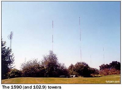 Our last stop of the day proves to be a disappointment - not that we were expecting much to begin with. The former KIIS (850 Thousand Oaks) had gone silent a few months earlier, and we knew that the reason it had gone dark was that it was losing its hillside tower site to development, and that the old towers were already gone. That didn't stop your editor (and fellow DXer/tour guide Dennis Gibson) from clambering to the top of a hill to see what we thought was the old site - and turned out to be a reservoir, instead. With a pressing appointment in LA and a flight to catch later that night, that was the last chance I had to find the location, but as I drove away about half an hour later, my cell phone rang with Dennis' announcement that he had found the towers on the next hilltop over, in a fast-growing residential area not far from the Ronald Reagan presidential library.