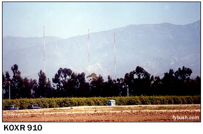 After (very carefully) turning around and heading back out to 101, our next destinations are inland, where the relatively affluent coastal community of Ventura gives way to the agricultural communities of Saticoy and Santa Paula. Right off CA 118 at CA 232 in Saticoy, a gated road to a railroad facility leads as well to KOXR (910 Oxnard), a ranchero station that's a sister to KXLM. KOXR's three towers put out 5000 watts by day, 1000 watts by night.