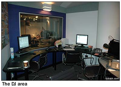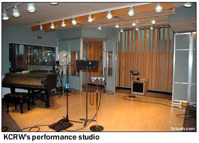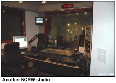 The first thing you see when you enter is a hallway that leads down to the performance studio, shown above. KCRW's "Morning Becomes Eclectic" show brings a lot of great performers through here, and the facilities are up to the task - it's no wonder that the CDs of KCRW live performances have become collectors' items. Through the window at the left side of the performance studio is the main air studio, which has a most unusual layout. In addition to the usual U-shaped studio furniture for the jock or master-control operator on duty (including turntables concealed under a panel, for those occasions when the overnight freeform jocks just have to play some vinyl), there's a news booth that's walled off from the rest of the room. And in the corner, there's another U-shaped area with computers and office space for tje KCRW music staff! (The window from the DJ area looks back into the performance studio.)