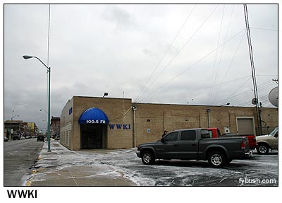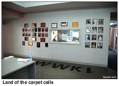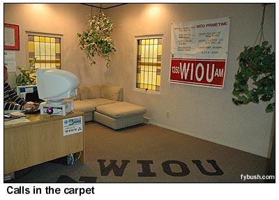 Down the hall, we pass the sales offices and head down the corridor to see the studios. There's a live jock spinning the hot AC at "Z-92" (and back behind his studio, a low-ceilinged bomb shelter that's a relic of the station's early days out here - WIOU signed on in 1948, followed by what was then WKMO on 93.5 in 1964.) Across the hall, WIOU has a nice-sized newsroom with an actual live afternoon newsperson working there, and beyond that there's an actual live afternoon talk show taking place on AM 1350. The WIOU transmitter and an auxiliary for WZWZ sit near the 1350 studio (Z-92 now transmits from a new tower on the west side of town, though it's suffering from icing problems on this day that have it running at very low power), and at the north end of the building there's a brand-new studio that's just been built for WMYK, "Classic Hits 98.5," which moved down here from its little closet of a studio in Peru a few months earlier. (And in keeping with the Kokomo floor-covering ethos, there's a nice "98.5" logo installed in the carpet right inside the door of the WMYK studio...) From here, we head north into Kokomo itself for a visit to the other guys in town, Citadel's big-signal (a full class B) WWKI, which blankets central Indiana with country as "100.5KI" (We'd already stopped by its tower southeast of Kokomo on the way from WTTK to WIOU.)