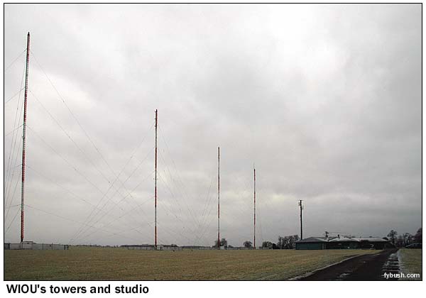 This is also still the transmitter site for WBAT, and the old Gates was still chugging along in the back room, running off a small generator in the garage, since this part of Marion was also without power on this icy January day. After thanking our new friends at WBAT, we pointed the car west, en route to Kokomo. But before we got there, there was one more stop to make to the south, just beyond the little hamlet of Windfall, Indiana. That's where we checked out the tower of WTTK, Kokomo's very own TV station on channel 29 - not that anyone in Kokomo would recognize this as a local station, and with good reason: it's a satellite of WTTV, Channel 4 way down in Bloomington, and it's here to fill in the "WB4" signal on the north side of the Indianapolis TV market. (Marion's "hometown" TV station is similarly part of the Indianapolis market; WNDY-TV, channel 23, sits another 10 miles or so down this same road, Indiana 213, and it's the UPN affiliate for Indianapolis. Just after our trip - which didn't include a stop at WNDY - the station would be sold to LIN Television, which owns the CBS affiliates in Fort Wayne, Indianapolis and Lafayette, the last of which we'll see in our next installment.) ![]() Instead of heading south to see another nondescript UHF tower, we head north on 213 and west again on Indiana 26, through some of the heaviest ice we'll see on this trip, until we arrive on the south side of Kokomo. No Beach Boys sunshine weather here today - it's still bitterly cold as we make our way down the flooded-and-frozen driveway that leads to the Mid-America Kokomo stations, WIOU (1350), WZWZ (92.5) and WMYK (98.5 Peru).