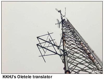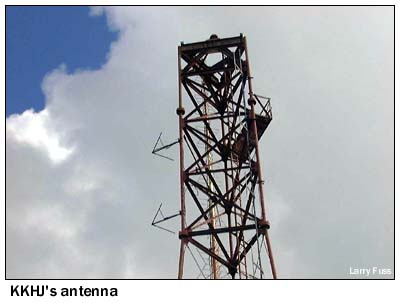 Now, if you're starting a station on "93" and you're a big fan of classic top-40 radio, what do you call it? Why, "KHJ," of course - and it happened that the KKHJ calls had just become available, having been given up in Los Angeles when 930 there returned to its heritage KHJ callsign. So Larry and Kirk snapped up the calls in American Samoa, and "93KHJ" was back on the air - albeit serving an audience tens of thousands of miles away on the other side of the Pacific. It's a neat little radio station, programming hot AC with lots of local content, including the popular "Samoan Sunrise" morning show. (You can hear streaming audio and see pictures of the studios at the 93KHJ website, www.khjradio.com.) And the South Seas Broadcasting empire has grown. Below, you can see KKHJ's translator, K229BG, licensed to Pavaiai, atop 494-meter Mount Oletele, near the village of Aoloaufuo. (It's another 2-bay SWR antenna, and that's a cellphone tower that it's mounted on. And no, I can't pronounce "Aoloaufuo.") There's an AM station as well: WVUV, Leone operates on 648 kHz, though it lost its towers a while back and is using temporary facilities and simulcasting KKHJ. If that frequency seems odd for a station with US calls, it should: this is within a region that uses 9 kHz spacing, but most of the cars on the island are American and tune in 10 kHz increments. So WVUV has applied to move to 720 kHz, a frequency that's common to both spacing schemes. (Larry and Kirk have a pending application for a new signal on 900 as well.)