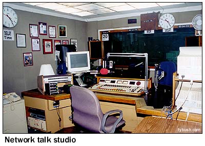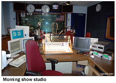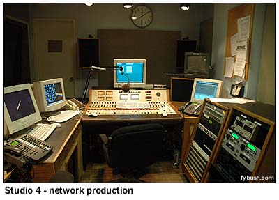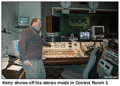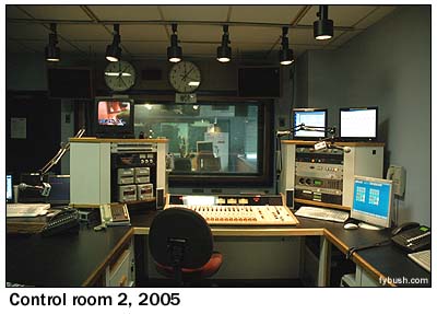 The window on the right in the picture at left is the very same window on the left in the picture at right, and the studio into which it looks, Studio 2, is used for much of WOR's local talk - Ed Walsh in the morning (those CD players on the right side of the desk allow him to play his music) and Bob Grant in the afternoon. That's ENCO automation running on the screens at left, and that door looks into a control room (Control 2, of course) that then leads into the station's master control, about halfway down the hallway.