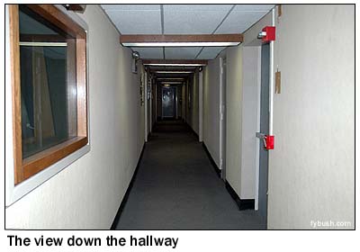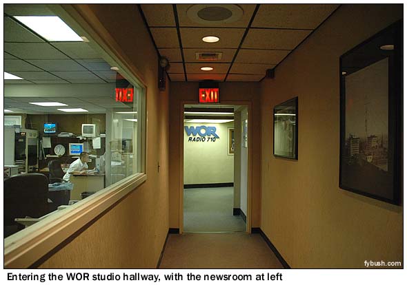 From here, we round the corner past that "WOR Radio 710" sign, and we're now on the main hallway of studios, which run along the Broadway side of the building, 23 stories above Times Square, and along the other side of the hall as well, facing out on the air shaft.