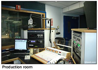 We pause, then, to pay homage to what may well be the longest association between a commercial radio station and a single address in history: WOR, 1440 Broadway, New York. In 1928, Bamberger's department store installed a Manhattan studio for what was then WOR, Newark in that Times Square office building. A few years later, "1440" became the sole studio location for WOR, and over the years, that's where WOR remained. As the decades went by, things changed. WOR-FM moved in in the forties, moved to its own quarters on the second floor in the sixties, became WXLO and then WRKS, and then moved out in the eighties. WOR-TV (Channel 9) ended up here as well after a circuitous path that took it from a transmitter on the Palisades in New Jersey to an overly costly studio facility at Broadway and 67th Street to a control room at Empire State Building. WOR (710) itself moved around within the building, operating on the 24th floor and then moving, in 1976, to a suite of offices that filled the 23rd floor and extended down to 22, where the WOR Radio Network's offices were to be found. And on April 30, 2005 at noon, WOR will make its last broadcast from 1440 Broadway before the station completes its move to new quarters at 111 Broadway, down near Wall Street. Fortunately, your intrepid photographer has had several opportunities over the last few years to visit WOR at 1440, thanks to the kindness of Buckley Broadcasting director of engineering Tom Ray and WOR chief engineer Kerry Richards, and so this week we dedicate Site of the Week to a profile of this most historic site in broadcasting history. Come inside, take a left past the reception desk, pass the men's room (did you know that it was a much earlier WOR men's room, circa 1927, that functioned as the very first control room for what would become the CBS Radio Network?), turn right past the engineering offices and down the hall full of historic photos, and let's go: ![]() As we round the corner (we're actually circling the air shaft down the middle of this old building), we see on the right some of the historic photos that will soon be moving to 111 Broadway, including that neat one of the WOR antenna mast atop Bamberger's in Newark. There are also photos of an early WOR transmitter in Kearney, N.J. and of Jack Poppele, the legendary engineer who spent so many decades innovating at WOR. On our left is the newsroom, and just beyond it a small studio ("Studio 5") that's used for production.
