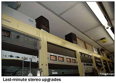 This is one crowded little room, dominated by a long row of racks full of patch bays, STL gear (it's a nice clean microwave shot from here across the Hudson to the Lyndhurst, N.J. transmitter site), satellite receivers, processing and so on. And it's become an even more crowded room in recent years, as Tom and Kerry have modified WOR to become one of the first IBOC digital AM stations - and, just months before vacating these studios, to produce all its programming in stereo. That's meant everything from a new top-of-the-hour time tone to rewiring the consoles throughout the plant to pass stereo - and it sounds pretty good, too, on the IBOC (er, HD Radio) monitors that have now been installed in these racks. On the left, we see some of the last additions that were ever made to the 1440 Broadway plant, including stereo meters and monitors and an upgraded STL. Just out of frame is the HD Radio off-air monitor, a car radio installed in a rack-mount panel. (It replaced one of Ibiquity's very first pre-production, homebrew tuners, which filled something like six inches of rack space all by itself.) A final note about these racks: an inventory tag on the back of one is apparently the last place you'll see the old "WXLO-FM" calls anywhere in this building.
