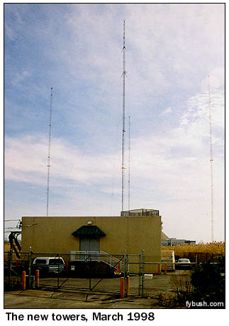 In the mid-nineties, the company began addressing the signal problems at WINS, entering into international negotiations aimed at allowing WINS and Toronto's CFRB to direct more signal at each other. In 1995, WINS demolished the four 1943 towers at Lyndhurst, temporarily operating with 10 kW non-directional from the WABC auxiliary tower in Lodi while building four new 410-foot towers in Lyndhurst. (CFRB also rebuilt its array in Mississauga, Ontario at the same time.) The new array allowed WINS to let out some of its tight nulls over the New Jersey suburbs, especially at night, but the station's programming remained tightly focused on the New York City audience, especially after Westinghouse's acquisition of CBS made WINS a sister station to what was once its all-news competitor, WCBS (880), as well as sports giant WFAN (660). (The new tall towers also provided a useful spot for an auxiliary antenna for WNEW-FM 102.7, which had by then become a Westinghouse sister station to WINS.)