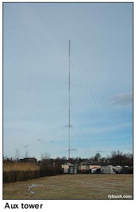 It's a short walk back across the open field to the 185-foot backup tower, erected in 1956. In addition to keeping WABC on the air during maintenance on the big stick, this tower has been a lifesaver for several other stations over the years. WNBC used it for a while after the 1967 plane crash that demolished its tower on High Island, and WINS used it for several months in 1994-95 while its site in Lyndhurst was being rebuilt. (UPDATE: Dan Strassberg reminds me that the auxiliary tower was also used for several months in the fifties by WNEW, whose then-new 50 kW plant in Kearny had been severely damaged by a hurricane. Dan says several other stations also suffered severe damage from that storm, and that WHN and WAAT ended up sharing the auxiliary WOR transmitter in Carteret, alternating use of the facility for a few weeks until they could get their own plants rebuilt.) It was recently reconfigured for use by WABC's sister station WEPN (1050), which can operate from Lodi with 12 kilowatts, non-directional, if construction around its main site in East Rutherford forces it to go off the air there. (That would, however, be a temporary measure; contrary to the rumors that have floated around several message boards, there don't appear to be any long-term plans to make Lodi a permanent home for the 1050 signal.) So there you have it: not the most glamorous or scenic site in America, by a long shot, but it's hard to imagine many transmitter sites that have the romance or history that WABC does. If you'll be spending your Memorial Day listening to "Rewound" (as we certainly will), now you, too, can say you've seen where it all came from back then. And next week, we'll wrap up this look at the Meadowlands sites with a late-night visit to WABC's erstwhile top-40 rival, WMCA. It's here - the 2005 Tower Site Calendar is now available at special clearance prices! Click here for ordering information!