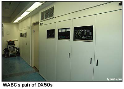 When my tower-photography colleague Jim Hawkins visited this site in the 1960s (as chronicled on his WABC Transmitter Page), those windows looked in on a far wall that held a General Electric BT-50A on the left and a Continental 316B 10 kW backup transmitter on the right, with a control panel sitting in the center of the room. Today, the middle of the room is occupied by racks full of audio processing gear, STL equipment, monitoring gear and patch bays. Where the BT-50A once sat, there are now a pair of Harris DX50s. And where the 316B once sat, there was later a Gates/Harris MW50. That MW50 and the GE (which entered backup service once the MW50 arrived) were the very transmitters that carried Musicradio 77 to the masses. The MW50, itself relegated to backup duty, was retired a couple of years ago and offered on eBay. At the time of our visit, it was sitting in two pieces in the back room, awaiting pickup and a move to its new home out West.
