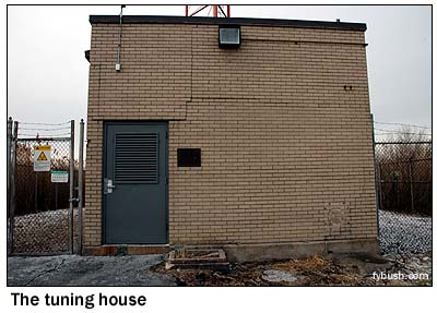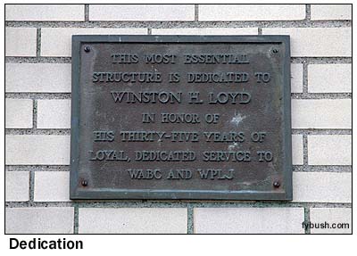 The rest of the building is unexciting; a few storage and office rooms in front, a big space in back that once held all the transformers for the big tube transmitters and is now used mainly for storage (it's also where the Harris DX10 transmitter that was used by 1010 WINS while its site in Lyndhurst was being rebuilt in 1994-95 was located), a dummy load cleverly mounted up near the roof, and of course generators for backup. So from here, we head outside, down the long path that leads to the base of the big tower at the far corner of the property. A substantial tuning house sits in front of the tower base, and careful inspection reveals a plaque on the front dedicating the building to longtime WABC/WPLJ engineer Winston Loyd, signer of innumerable WABC QSL cards for generations of DXers who listened to this huge signal across the proverbial "38 states and half of Canada" and far beyond. Inside the door, we see the tuning network that was the last thing the WABC signal passed through before going out the window in back, into the tower and out to millions of listeners. With the lights off in the building, it's very neat to watch the fluorescent tubes flicker in time with Rush Limbaugh's voice. (Maybe we'll add the video to the page eventually...) The tower base itself is behind a high brick wall at the back of the building.