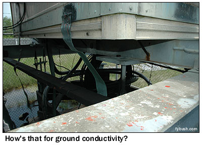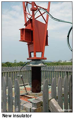 This week, we head out the back door and down the catwalk that stretches over the swampy land behind the building and out to the two 520-foot towers that dominate the landscape in this part of the world. These towers were half-wave on 990 kHz, the frequency WBZ used in 1940, and that makes them just a bit over half-wave - 188.5 degrees - and a bit more than a quarter-wave apart (93.6 degrees) on the 1030 kHz frequency that WBZ moved to in 1941. Those details aside, this is as basic a two-tower cardioid array as it gets. What's not so basic is the process of dealing with the effects of six decades of salt air on these towers, and that's a challenge that the WBZ engineering staff faced a few years back when it came time to renovate the site.
