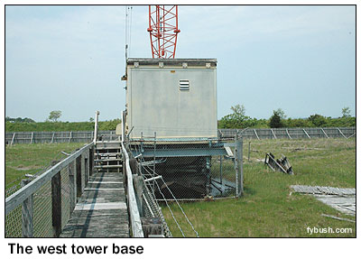 At the same time, WBZ still had to address the very real problem that the steel in the towers was in bad shape in some areas - and that's not even mentioning the 60 year old insulators at the base of each tower or the aging tuning networks. Some of the nation's top engineering consultants were put to work on the problem, and here's the solution they arrived at: by replacing the existing two levels of guy wires on each tower (which didn't reach anywhere near the top of the towers) with five levels of guys, the towers could be stabilized against just about anything nature could throw at them. Through much of 1999, WBZ operated from its 10 kW backup transmitter at its studio site in Boston's Allston neighborhood while the work proceeded out at Hull. New base insulators were installed, and workers moved up and down each tower in tented enclosures to contain the lead paint that was released as each tower was carefully restored to stable condition. In effect, each tower was rebuilt in place, and by 2000 WBZ was back to full power from the rebuilt Hull site, complete with new tuning houses (replacing the old ones that had been directly beneath each tower.) And speaking of those tuning houses - take a look at the photo below, showing the support frame that keeps each one elevated over the swamp below. It's hard to imagine much better ground systems than this one, which connects directly to the salt water of Massachusetts Bay.