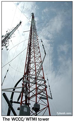 We'll come back inside for a moment - but we've got to take a look outside, too, where the old WCCC-FM tower got a companion a few years back. Both towers are about 345 feet tall, and both are skirted. The skirts are there for two reasons - first, to provide detuning so the towers don't disturb the pattern of nearby blowtorch WTIC (1080), just a couple of miles to the south, and second, because this has also been an AM site for a few years now. WTMI is the former WCCC(AM), and it lost its original West Hartford site and moved here a while back. It now runs 490 watts by day from one of these towers, with the other detuned on 1290 as well to avoid disturbing the 1290 signal. WCCC, of course, is a legendary rock station in Hartford, and WTMI is about as far opposite as you can get. After years of simulcasting with the FM, Marlin flipped 1290 to classical in 2002, picking up the calls that had been on its Miami FM classical station (which was sold) and giving the beethoven.com classical webcast (which had been an outgrowth of Miami's WTMI-FM) a broadcast home in the market. WTMI was one of the first stations in New England to add IBOC digital service, and you know what? It sounds awfully nice in digital, and the signal, while limited, does reach the affluent suburbs where the station would be most likely to find a loyal audience once the radios are available. (Even on the analog AM signal, WTMI has a small but loyal audience.) With its commanding position astride a major commuter route into Hartford, this site is also very popular with wireless carriers and two-way users; you can see some of their antennas on the tower at left. And after a most comprehensive tour with John, we're off to the south. Over the next two installments of Site of the Week, we'll take you inside WTIC's magnificent transmitter plant. Stay tuned! JUST RELEASED - it's your very first chance to order the 2006 Tower Site Calendar! Click here for ordering information!