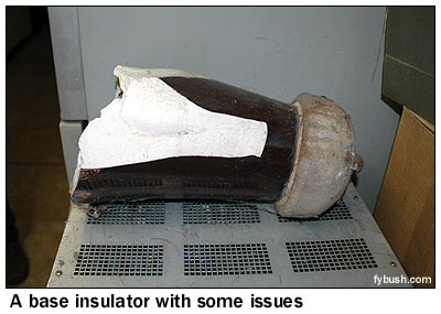 The day began up at the historic West Peak site in Meriden, one of the earliest FM transmitter sites in the nation and still home to most of the Hartford market's FMs. We'll show you those towers in more detail another week - alas, when we got up there, it was in pretty heavy fog and we weren't able to get very good exterior photos. (We'll fix that, sooner or later.) The skies began to clear, thankfully, as we drove down from Meriden and headed west to Farmington, a leafy Hartford suburb. There on Birdseye Road is the station now known as WLAT (910 New Britain) - but this site has a history that long predates those calls. The 910 facility went on the air in 1949 as WHAY, using this very site and a small transmitter building off to the edge of this image. In later years, the station was known as WRCH, then WRCQ, then WNEZ (all-news, starting in 1990, and later urban "910 Jamz."). Since 2001, when it swapped calls with the 1230 facility in Manchester, it's been Spanish as WLAT, and today it's one of the top Spanish-language radio voices in the market. During the WRCH/WRCQ years, the station added an FM signal on 100.5, known as WRCH-FM, and it was then that a solid brick building was built along Birdseye Road to house the WRCH/WRCQ studios and transmitters. With the coming of duopoly and then clusters, the studios eventually moved out (WRCH-FM is now an Infinity station, operating from their studio complex a few miles away), but the space found a new use as the home of the Connecticut School of Broadcasting. The WRCH-FM transmitter moved eventually, as well, finding a home on the tall towers of nearby Rattlesnake Hill - but an aux site remained in place here (check out the four bays on the tower off to the right) and is still used on occasion. WLAT uses the four in-line towers for its 5 kW night signal; it's 5 kW non-directional days. The transmitter room has some nifty old gear in it - below, you see the Rockwell Collins that's a backup for WLAT, the vintage Raytheon (!) phasor cabinet, completely rebuilt more than a decade ago, the Nautel that now powers the AM and the vintage Collins that serves WRCH for backup use. And off beyond the Collins is a good reminder, as chief engineer John Ramsey tells us, of the importance of checking out your tower system: that's an insulator that shattered as it was being replaced. It turns out it was in rougher shape than anyone realized, and would likely have failed on its own if there hadn't been an insulator replacement project underway.