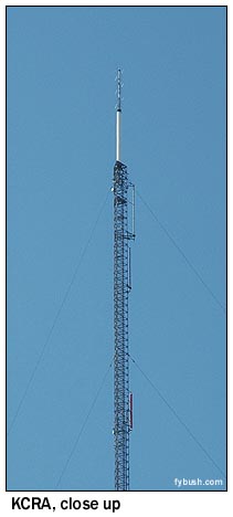 The tower's a most impressive sight as we drive away, and well worth making a stop to grab the medium-distance views you see above, showing KCRA's interesting helical antenna at the top of the tower, with KMAX's antenna just below. (It's also not a bad view of the KTXL tower across the river to the northwest - that tower is home to Fox affiliate KTXL 40, KVIE, whose channel 6 panel antenna sits a bit lower on the tower, and their DTVs, on 55 and 53, respectively. Off to the right is the short tower of public radio KXJZ 88.9, one of only two FMs out here.) ![]() We, however, are headed south, back out under I-5, then down to Walnut Grove Road and under 5 again, heading west to the original candelabra and its newer cousin. These towers, too, are very nicely visible to the south from the KCRA site, which is where we grabbed the shot you see above. That's the new one on the left and the original on the right, and it's to the new one we go first.