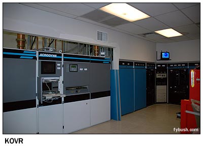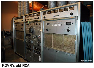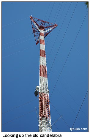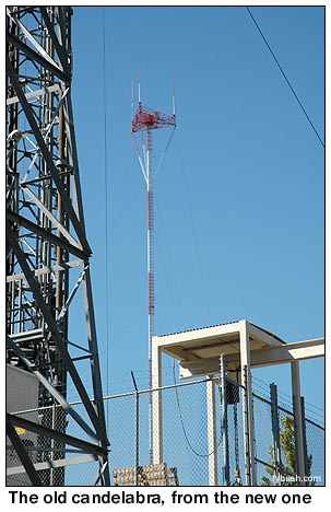 At the end of the hallway is KOVR, the facility Bob designed and built when this tower went up during his first stint with the station, and which he's now rebuilding for DTV. (Bob's also having the unusual experience of rebuilding the KOVR studios in West Sacramento, which he built originally in the late eighties.) Having been a Sinclair station, KOVR inevitably has an Acrodyne transmitter (the broadcaster owns the transmitter company) for its channel 25 digital signal, with the Harris handling the analog signal on 13. A few months after our visit, this site made headlines in a most unwelcome way, when a "BASE" jumper from the Bay Area decided to trespass here to celebrate his birthday. He climbed the tower, jumped, and got himself stuck on one of the guy wires, requiring a dangerous and expensive rescue. This column doesn't condone such activities - towers are for photographing, and perhaps for an elevator ride if an engineer offers, but they're not for climbing without permission. See that fence in the picture to the left? It's there for a reason. In any event, the old candelabra, seen at the center of that photo, is our next stop. It's by far the most accessible of the sites, located at the end of one of the side streets in the little town of Walnut Grove, and it's also the least flood-prone of them, since it sits behind - actually, right on - a levee. The transmitter buildings at this site were built side-by-side, and we're treated to a nice tour of KOVR's rooms, which are mainly used these days for storing of old studio and transmitter gear. There's a vintage RCA transmitter here (I want to call it a TT-30, but I'm sure an RCA expert out there will correct me if I've got that wrong) that needs some work, and a big control room from the days when transmitter sites like this were staffed, but the goal is to use this space, eventually, as an emergency transmitter and studio facility for both KOVR and KMAX, should the need arise. At the moment, the only stations using the old candelabra as a primary transmitter site are KCRA-DT (Channel 35) and Family Radio's 88.1, which was then KEDR and has since taken on the KEAR-FM calls that used to be at San Francisco's 106.9.