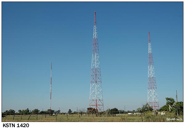 We'd long believed that we knew where to find all the diamond-shaped Blaw-Knox towers still standing - the two giants at WLW in Cincinnati and WSM in Nashville, the three-tower array (two of them reconstructed after a 1980s hurricane) at WBT in Charlotte and the smaller versions at WFEA in Manchester and WBNS in Columbus. Add to that the now-gone Blaw-Knoxes at WADO New York, the old WABC in Wayne, N.J., WCAU's site in Newtown Square, Pennsylvania and WHO in Des Moines, and that's all the diamond towers that ever stood - right? Then we got an e-mail from Paul Shinn, chief engineer for most of the stations in Stockton, California, telling us that he had an actual Blaw-Knox diamond still in use at KSTN (1420), which was about all the prodding we needed to make Stockton a stop on our next trip to northern California - and are we ever glad we did! There it is, out there at the end of Ralph Avenue, southeast of downtown, behind the studio and the two larger towers: all 162 feet of KSTN's tower 3, which is used only in the station's 5 kilowatt day operation (at night, it's 1 kW into the two big towers), a pedigreed Blaw-Knox, complete with the original blueprints still on file in the building.