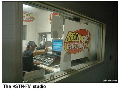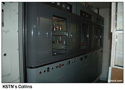 As neat as the little Blaw-Knox is, it's only one part of the overall historic experience to be had among Stockton's AM stations. Inside the KSTN building, there's plenty of history as well. For starters, KSTN's AM signal at 1420 is still playing music, live and local at that, and drawing healthy listenership and ratings in the process. (And it's locally owned and operated, by Knox LaRue and family.) It's got a great cluster of transmitters in the back room, too, including the beautiful vintage Collins shown at left and below. There's also a Bauer 707, of much newer vintage - but the Bauer's the auxiliary transmitter. The old Collins still serves primary duty, and it looks (and sounds) absolutely great doing it, with those tubes glowing in time with the music. The building also houses KSTN-FM on 107.3, which was one of the first Spanish-language outlets in the region. Today, "La Poderosa" is a radio monster, with a grandfathered superpower class B signal that reaches from Sacramento down beyond Modesto, and east into the Bay Area.