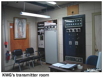 At the time - and indeed, until just a decade or so ago - the transmitter's output went right out the top, through a hole in the roof, and right up to a wire "T" antenna that stretched between two tall telephone poles mounted on each end of the building. The poles were replaced by a conventional vertical radiator in the nineties, but you can still see the stubs of each (painted red and white, no less) - one's visible at the left in the exterior photo above, and you can just see the replacement tower at the extreme right, too. The old McClatchy was eventually replaced (after a very long run) with a Harris MW1, and that in turn has been relegated to auxiliary duty as well. What would the old McClatchy engineers make of the solid-state BE AM1 that now occupies just a couple of feet of rack space at the left of transmitter row? (And if you're wondering about the Madonna-and-child to the left of that, we should explain that for the last few years, KWG has been part of the Immaculate Heart Radio group that operates several Catholic stations in the region...)