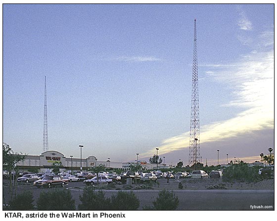 ![]() November 25, 2005 Four AMs for "Black Friday"By SCOTT FYBUSH If you're anything like us, there's nowhere you'd rather not be on this day after Thanksgiving than the parking lot of a shopping mall. It's not really the best spot for a broadcast transmitter, either - all that steel can wreak havoc on a directional pattern, and all that asphalt can make it hard to repair problems with a ground system. But when land is scarce and expensive, sometimes there's just no choice, and that's where this week's featured towers come in. ![]() We'll start this week's feature with a site we've never featured here before. This is KTAR, Phoenix, Arizona, with 5,000 watts at 620 on the dial. In 1940, when this site was built, this stretch of East Thomas Road must have been out in the middle of absolutely nowhere, several miles north and east of the downtown of what was then a small Western town. Needless to say, Phoenix grew rather dramatically, and even by the late fifties, the land on which the KTAR site sat was worth lots of money for developers. So the site got paved and developed (as "Tower Plaza"), and then redeveloped in 1997. Now there's a Home Depot and a Wal-Mart sitting between the towers, one of which now sits, fenced-off, in the front parking lot, and the other of which sits out behind the Home Depot. (You'll find this photo, by the way, on the May page of the Tower Site Calendar 2006, which would make a fine gift for the radio person in your life...) ![]() KTAR may be important, but it's not the biggest signal to come from the middle of a shopping center. That honor goes to Atlanta's WSB, which is also featured in the Tower Site Calendar 2006 (on the December page), and which we've featured in great detail here on Tower Site of the Week back in February, 2005. ![]() Our next stop comes in Allentown, Pennsylvania, where drivers heading north from US 22 on PA 145 once saw two directional arrays right across the street from each other. On the west side was WKAP (1320), playing the top 40 hits, and on the east side was WSAN (1470), playing album rock on AM. Then came the developers. By the early nineties, the 1320 site was gone, paved over and replaced by a brand-new Best Buy. (After being dark for a bit, 1320 resurfaced a few miles to the south, diplexed with WHOL 1600. It's now a sports-talker with the calls WTKZ.) Across the street, 1470 ended up with the WKAP calls and an oldies format - and its three towers ended up right in the parking lot of the Whitehall Mall, crammed rather uncomfortably between what I think was a Sears store and the street. I needed a wider lens when I visited that site in 1998 - that's a montage of two photos above, and I wasn't able to get quite far enough back to show just how these towers sit right in the middle of the lot, but there they are.