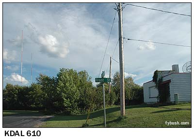 Continuing west on 105 to the state line, we cross the St. Louis River to the "New Duluth" neighborhood, where we see the single tower and studio of 10 kW religious daytimer WWJC (850) - and then turning north on Grand Avenue for a few miles, heading back towards downtown, we come to the two-tower site of KDAL (610), where 63rd Avenue dead-ends at Front Street. KDAL runs 5 kilowatts non-directional by day, using both towers with 5 kilowatts at night.