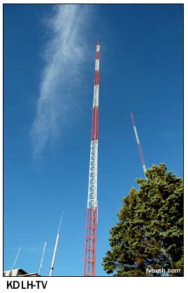 Duluth, as you might glean from the site of the KQDS-TV studios, is a very hilly city, sloping down steeply from the granite hills west of the city to the shores of Lake Superior down below. The city itself is arrayed along a series of terraces parallel to the lakeshore. And up at the top of the hills, all those TV stations - and a whole slew of FMs, too - occupy one of the more scenic tower farms in America, up among the pine trees and lakes overlooking Skyline Drive. (Speaking of skylines, the view below at right looks down from the TV tower farm towards Minnesota Point, the narrow spit of land that separates Superior Bay from Lake Superior. Duluth's famous Aerial Lift Bridge, just out of frame to the right, connects Minnesota Point to the rest of Duluth, and is said to be the city's top tourist attraction, at least for tourists who aren't also radio geeks.) In the view below at left, we see the oldest tower in the farm. That little self-supporter at right was the original WEBC-FM (92.3) tower, which rose 550 feet from the hill when it was built in 1947. WEBC-FM didn't last, and after a brief stint as the original site of WFTV (Channel 38), the tower was partially dismantled. (It's now a telco relay site.)