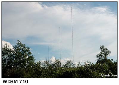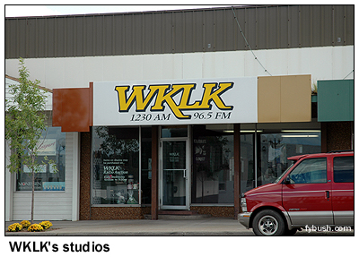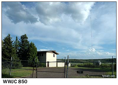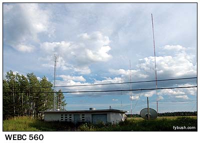 Since the early seventies, Bruce Elving has published the "FM Atlas" (now in its twentieth edition), and for the last twenty years or so, that's been accompanied by the monthly "FMedia!" newsletter, all published from "Publishing Estate" in Esko, Minnesota, where our little band of radio folk stopped for a most enjoyable visit with Bruce and Carol. Just like in "Alice's Restaurant," their house used to be a church - but in this case, when they took out all the pews, they filled the space with computers and printing equipment to produce their little media empire. Just down the road from the Elvings' place, we found the tower that's used by the two stations in nearby Cloquet (rhymes with "Parkay") - WKLK (1230) and WKLK-FM (96.5). (This is the second incarnation of WKLK-FM; the first, which started as a class A facility on 100.9 and was upgraded and moved to 100.5, was sold to Minnesota Public Radio in the eighties and is now WSCN.) Later that weekend, we'd also get a look at their storefront studio in downtown Cloquet (above right) - but for the moment, we were in a hurry to get to Duluth (actually to Superior, Wisconsin, across the bridge, where we found the least unaffordable hotel room in town), set up the tape decks and the VCRs, and then get out and see the towers. Being - there's no other way to put this - so far from everything else, Duluth ended up with a bunch of AM signals nice and low on the dial, with reasonable amounts of power from directional arrays that are all clustered south of town and aimed north. Our first stop is one of the few transmitter sites that's been the subject of a graduate-school thesis: WEBC, which moved to its present site at US 2 and County Highway Z in Parkland, Wisconsin in 1954, when it moved down the dial to its present spot at 560, where its three-tower directional array protects co-channel WIND in Chicago. Another venerable AM, WDSM (710 Superior), also operates from south of Superior on the Wisconsin side of the border, where its four-tower array sits at the end of Pokegama Road, near route 105, cranking out 10 kilowatts by day and 5 kW after dark.