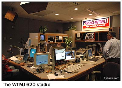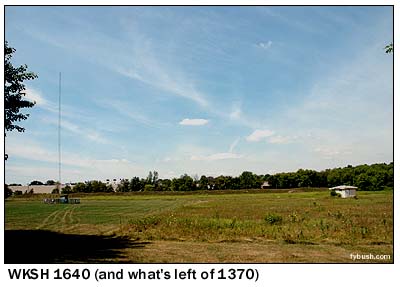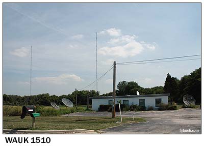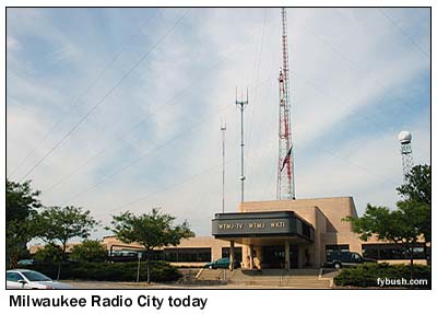 And while Garrett was working on plans for those tours, I became fascinated by reading the history of WTMJ's "Radio City" facility, the first standalone building in the U.S. designed for both radio and TV broadcasting. That prompted a phone call to the great folks at Journal Broadcast Group asking about a tour - and suddenly, our schedule in Milwaukee was packed about as full as it could get! Our Milwaukee adventure began late on the morning of Wednesday, August 17, as we drove east from Madison. The first stop, 25 miles west of downtown, was in a state park in Delafield, home to WHAD (90.7 Delafield), the Milwaukee outlet of Wisconsin Public Radio's "Ideas" network. We couldn't get especially close to the WHAD tower, and with so many other sites beckoning us, we didn't spend a lot of time trying. Our next two stops were in the Waukesha area, where there was a remarkable amount of road construction underway to handle all the suburban growth out that way. WAUK (1510 Waukesha) no doubt once sat on a lonely rural road. Today, it's on a little dead-end driveway behind a Wal-Mart on Les Paul Parkway, named for the musician/inventor who hails from Waukesha. WAUK is an interesting station - its 10 kW daytime signal carries ESPN Radio for Milwaukee, and when the station signs off at sunset, the sports programming moves to leased time on WMCS (1290 Milwaukee). Every ID is thus "1510 days, 1290 nights," which is a heck of a mouthful. A couple of miles to the north, a little side road leads to the studios and transmitter site of WKSH (1640 Sussex), the Radio Disney outlet in Milwaukee. WKSH began its life as a 500-watt religious station using four towers on 1370, and the former transmitter building can still be seen at the right side of the photo below. (Garrett's 2004 pictures also show the brightly-painted studio building next to the remaining tower.)