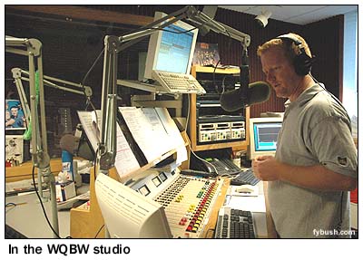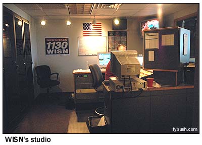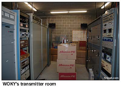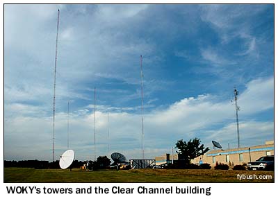Our next scheduled visit is out in Greenfield, on the western edge of the market, where another Kent - Kent Winrich, K9EZ, director of engineering for Clear Channel Milwaukee - is waiting to show off his facility. The Clear Channel studios at 12100 W. Howard Avenue are right next to the five towers of WOKY (920), one of CC's two AMs in the market, and the current studio building began its life as the WOKY transmitter building. Today, the WOKY transmitters - a modern Gates Five and a much earlier predecessor - and the WOKY phasors sit in a small concrete block building behind the main building, right in the middle of the five-tower array.