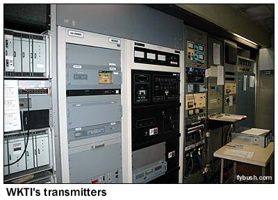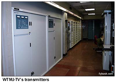 The 1078-foot tower is one of the tallest self-supporters in the country. It went up in 1962 to replace the original (1956) Channel 6 site, which was far to the north of Milwaukee. (The channel was originally allocated to suburban Whitefish Bay, and only later moved to Milwaukee.) A year after it went up, WITI decided to decorate their tower with lights. Strings of 25-watt lights ran up each tower leg, spotlights were aimed at the Channel 6 antenna, and a big illuminated "6" shone from lower down on the tower. The neighbors weren't pleased at first, but the "Tower of Light" became a Milwaukee landmark after a while, until the energy crisis of 1973 forced the lights to go off. (They were eventually removed from the tower some years later. There's a great picture on Dick's site - check it out!) So where were we? Ah yes, back across the river at the WTMJ transmitter building. Inside, a large transmitter room has WKTI's transmitters on the left and WTMJ-TV/DT in the center. It's mainly a Harris shop, except for the old RCA backup transmitter for WKTI, which is actually on the air this afternoon while the newer Harrises are being worked on. (Yes, that's an HD Radio exciter in the rack.)