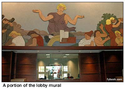 We're now ready to head into Milwaukee itself, and our first appointment is at WTMJ, where Kent Aschenbrenner, Journal Broadcast Group's director of engineering for the Great Lakes region, has graciously agreed to give our little band of radio history buffs an inside look at the Radio City building, on North Capitol Drive in the Shorewood section of Milwaukee, a couple of miles north of downtown. Radio City was built in 1941 to house WTMJ radio, FM station W55M and the projected TV facilities for the Milwaukee Journal, and little expense or effort was spared to create a state-of-the-art facility for the purpose. The original facility boasted an auditorium studio that could seat nearly 400 people, as well as a mural on all four walls of the lobby designed by Jefferson Greer, the sculptor who carved Teddy Roosevelt's face on Mount Rushmore. Executed in "sgraffito," an unusual technique in which colored plaster is carved as it's applied to the wall, the mural features designs representing "sending," "receiving," "sight" and "sound." (That's "sending," there, over the reception desk on the north wall.)
