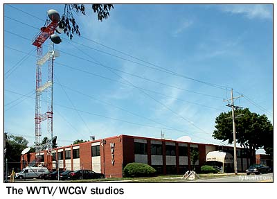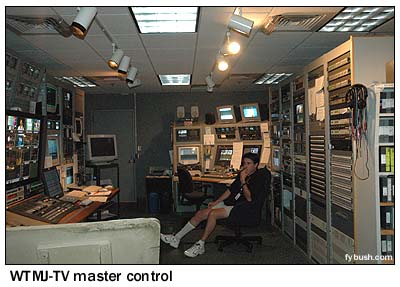 There's still more to see inside Radio City itself, including WTMJ-TV's ENG receive room, its TV control rooms and master control, plus some obscure little corners upstairs that were once film rooms and sponsor observation galleries and such. And Kent has a great collection of old WTMJ material in his office, which we pore over with great interest. (One more "Radio City" note: we were especially interested in this facility because NERW's hometown of Rochester, N.Y. has its own "Radio City," the 1948-vintage facility built for WHAM radio and TV with its own auditorium studio and similar Deco detailing. We'll feature that building - now occupied by WROC-TV, the successor to WHAM-TV - in a future Site of the Week.) With great thanks to Kent, we say our farewells and head out to see more Milwaukee sites, including a tower across the street that's home to WJZI (93.3), WMIL (106.1), WCGV (Channel 24) and WVCY-TV (Channel 30), and a few miles to the west, the studios of Sinclair's WB affiliate, WVTV (Channel 18) and UPN affiliate, WCGV, at 35th and Capitol. (Not only does this building completely lack the romance of Radio City, it's also about to be much emptier - WVTV's "News Central" newscast will go away at the end of March.)