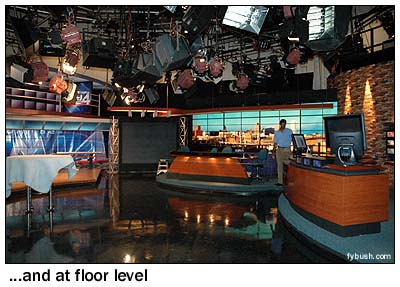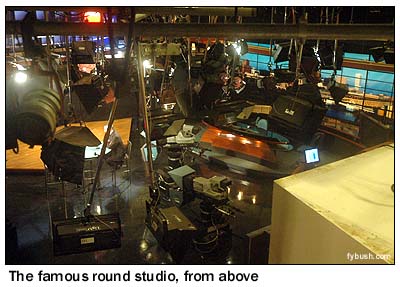 That studio still exists, and is still WTMJ-TV's main studio. Subsequent renovations, however, have obscured much of the roundness of the studio. The windows were covered over when they made it difficult to light the sets; a weather office was built into part of the studio (you can see a corner of that incursion in the view from above); the overhead cable system that dropped the camera cables down from the ceiling was replaced with more conventional cameras on the floor; and in the eighties, another addition to the front of the building on the east side covered up most of what was once the prominent round exterior of the studio. (That renovation, which created space now used by Journal Broadcast Group's corporate offices, also significantly altered the rest of the facade on Capitol, covering up some of the Art Deco details of the original Radio City building with a somewhat ungainly new canopy over a new front driveway.)