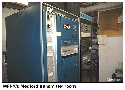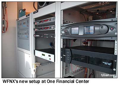 WFNX's transmitter room here is small, but functional, with the BE transmitter holding down temporary main-transmitter duty now that the Harris Z has been relocated to One Financial Center. (As we noted earlier, the BE has by now also been moved up to One Financial Center to resume its life as an auxiliary transmitter.)