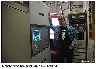 From WWZN, we follow Grady to the site that's currently his pride and joy - the 100 Mount Wayte Avenue facility in Framingham that was built for WKOX (1200) but now serves as a transmitter site for not only WKOX but also Alex Langer's WBIX (1060 Natick) and WSRO (650 Ashland). In an earlier installment of Tower Site of the Week, we looked at the site a few miles away that handles WBIX's night signal and the day and night signals of WAMG (890 Dedham). By day, though, WBIX is a big 40 kilowatts from Framingham, and Grady recently retired the station's venerable Harris MW50 (which began its life at WRKO) in favor of the very newest thing in transmitters, the Broadcast Electronics 4MX50. Yes, that's 50 kilowatts of solid-state power coming from a box no bigger than some of the fancy refrigerators in the expensive homes out west of Boston, and the unit Grady's posing with is the very first one to enter broadcast service anywhere. (A month later, we'd spot Grady at the NAB convention wearing a badge with a similar photo, reading "Ask Me About My 4MX50!") That's the old MW50 - part of it, anyway, to the left of the BE, and that's the little WSRO transmitter in the rack behind Grady. (Oh - and that's Todd Rundgren on Grady's shirt. He's a huge Rundgren fan. Check out the New Cars album...it's good stuff.) This was supposed to be the last stop of the day, after which we were going to head home to Rochester - but on the way down the hall to the WBIX transmitter (in the former WKOX garage), we pass the WKOX transmitter room, where a new BE AM10A transmitter has just replaced the old Continental that went in when WKOX moved from 1190 to 1200 and boosted power from a kilowatt in the late eighties.