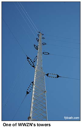 All that - coupled with what I've been told is relatively high rent for this site - has made it hard for 1510 to find much stability in ownership or formats over the years. Since the days of news-talk WITS, it's been standards, country, soft AC, Spanish, talk, religious, and most recently sports under the ownership of Sporting News Radio (formerly One-on-One Sports.) The entire Sporting News operation is now for sale, and so it's a pretty good bet that within a few months, 1510 will be doing something else again. So what about the actual facility there in the parking lot? It's powered by a Nautel transmitter (on the left in the photo above), which pushed the original Harris MW50 (on the right) into auxiliary duty. The phasor is in a container at the base of one of the towers, surrounded by a tall fence in the middle of the parking lot. (It was rebuilt a few years back, when the demise of WNLC 1510 in New London, Connecticut cleared the way for WWZN to loosen up its daytime pattern.) One more note before we leave WWZN - check out those unusual insulators on the guy wires in the photo at the top of the page! With its towers in the parking lot of a busy business park, there's lots of traffic passing right through this directional array every day. Not long ago, a truck actually clipped one of the guy wires, bending this tower and leading the station to turn to these double insulators, which are designed to handle far more than the usual guy-wire tension, allowing the guy wire to remain in place even if one half of the insulator breaks. (There's also a big sign reading "Danger - Do Not Drive Under This Sign" at the offending low-clearance spot.)