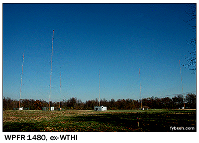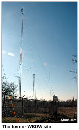 Up to the north of town, just beyond the "Twelve Points" neighborhood, we come to the six-tower array that was WTHI(AM) and is now religious WPFR. By day, it's a 5 kW signal using three of these towers in a row (I believe it's the three rightmost towers in the photo above); at night, it's 1000 watts from four towers in a box (I think that would be the four at left.) Heading back into the middle of town, the old WBOW/WBUZ site is indeed on - or at least near - the banks of the Wabash. Silent for more than half a decade, this two-tower facility is the site for several applications that were filed for new signals on both 640 and 1230 during the last AM window. (A number of applications were also filed for 1230 at the 1480 site, proposing diplexed operation.)