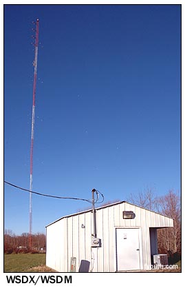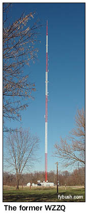 Crossing the river to West Terre Haute, busy traffic on US 40 makes it impossible to get good pictures of the little 1300 tower just west of the Wabash, or of the WWVR (105.5 West Terre Haute) and WMGI (100.7) towers a mile or so west of that. But we do head north to the Marion Heights neighborhood to see the tower for the defunct WZZQ (107.5), still in use by Rose-Hulman college station WMHD (90.7) and religious WCRT (88.5). Since the forced sign-off of WZZQ, the 107.5 allocation has been reserved for noncommercial use. It's likely to return - someday - as either a public radio station (Terre Haute currently has only a translator of Bloomington's WFIU) or a religious broadcaster. And we'll wrap up our Terre Haute visit about 15 miles east of town, at the tower of WSDX (1130)/WSDM (92.7) over in Brazil.