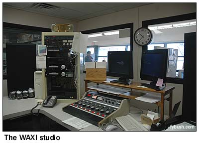 The WBOW calls were quickly snapped up on 102.7 (which had begun its life as WPFR and was then WLEZ), and eventually landed on 1300 as well (which had been operating as WJSH after signing on in 1958 as WAAC). And in 2002, the "new" WBOW stations, along with WAXI, landed right back at the 1301 Ohio Street facility where the "old" WBOW had been for many years. (By the time the old WBOW/WZZQ/WBUZ signed off, it had moved a few doors down to 1341 Ohio.) The building at 1301 Ohio had been converted into offices in the meantime, so it was rebuilt more or less from scratch when the Crossroads stations moved in. The big studio shown at the top of the page serves multiple purposes - it's home to the live afternoon show on the AM stations, as well as to WSDM in the morning. That's "Studio C," above, which is next to the big studio and is used by WAXI; one more room over is the studio that's used by WBOW-FM, and a production room behind them runs the AM stations in the morning as well. It's a very visible location right on US 40, and a nice spot for a radio station.