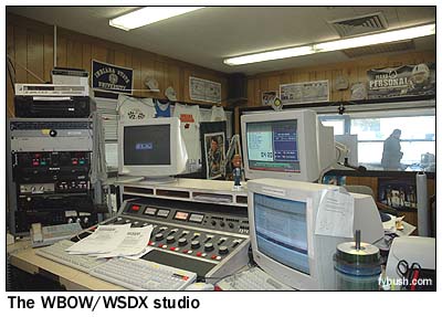 When we visited, WSDM had just completed a move from 97.7 (swapping frequencies with WCLS in Spencer, which allowed that station to move into the Bloomington market), which precipitated a series of format moves that relocated oldies from WSDM to WAXI (which had been standards) and launched the unusual "Crock" format on WSDM. The WBOW calls, meanwhile, have their own long history in the market. They originally stood for "Banks of the Wabash," and were originally found on the market's very first radio station, which signed on in 1927. That WBOW ended up on 1230 after World War II, and in the late eighties moved to 640 with 250 watts day and night. (The 1230 facility stayed on the air as well, changing calls to WZZQ to match its sister FM outlet on 107.5, then becoming WBUZ in 2000.)