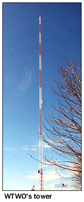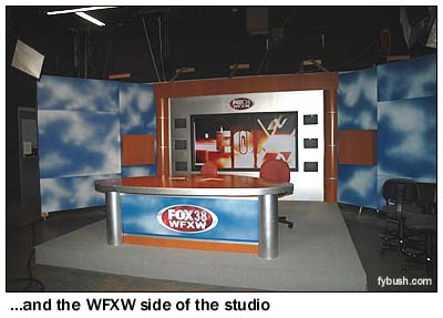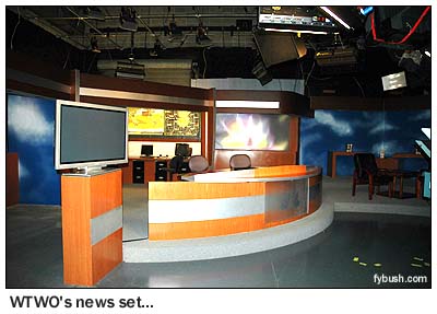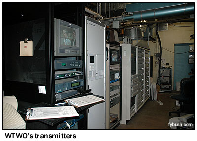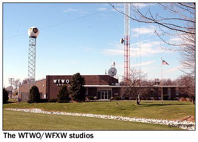 The building next to the thousand-foot tower dates right back to 1965, when it was considered enough of a showplace small-market TV facility to merit a long article in an issue of one of the engineering magazines of the day. Today, much of the facility's layout remains unchanged from that era, though there's since been a second station added. Fox affiliate WFXW (Channel 38) is operated under an LMA by WTWO owner Nexstar, and the set for its 10 PM news sits across the studio from WTWO's news set.