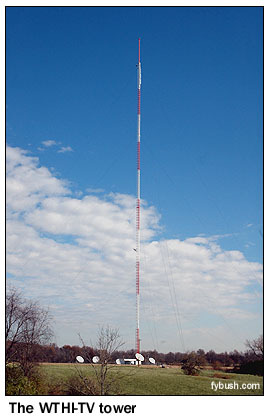 After a nice tour of WTWO, we head outside to look at the tower - and right across the street, the 995-foot tower of archrival WTHI-TV. To complete the set, the WFXW tower is just a short distance to the south on US 41, also checking in at just under a thousand feet.