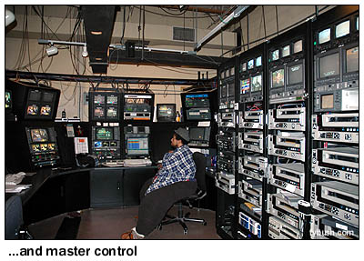 A newer control room for the newscasts also sits in back, and beyond that is the transmitter room, where the original General Electric transmitter now sits unused in front of the current Harris analog transmitter and a very low power DTV transmitter. (We couldn't pick up the WTWO-DT signal in our hotel room on the south side of Terre Haute at all.) Winding around to the north side of the building, there's a small newsroom, several rows of offices and the master control room for WTWO and WFXW. And if the WTWO call letters sound somewhat familiar at the moment, that could be because of the surprising amount of publicity the station garnered recently for the ad campaign touting the advantages of its Farmersburg-based weather radar over the WTHI radar, which sits next to the WTHI studios in downtown Terre Haute and therefore (at least if you believe the WTWO ads) misses storm action right in the middle of town. Somehow, even Jon Stewart got into the act, showing bits of WTWO's "negative advertising" on The Daily Show a few weeks back. (Hey - as long as you get the call letters right...)