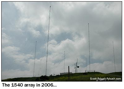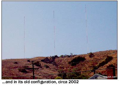 The 1540 signal in LA signed on in 1953 as KPOL, with 10 kilowatts, daytime only, into two towers on this site near the Ascot Reservoir. The third tower came along in 1957, when KPOL added a 10 kW night signal. Day power went to 50 kW in the early sixties, and by then KPOL-FM had been added up here, too, on 93.9. After several decades with beautiful music, KPOL AM-FM became country KZLA AM-FM in the late seventies, and the FM went its separate way in 1984, eventually moving up to the KCBS site on Mount Wilson, where it operates today under Emmis ownership. AM 1540 went Spanish, first as KSKQ, then KXED and KXMG. In 1997, it became the LA outlet for One-on-One Sports, as KCTD - and a few years later, as One-on-One became Sporting News Radio, 1540 adopted the historic KMPC callsign as its own. And just last year, KMPC completed a tower rebuild that replaced the three 1950s towers with six new towers, allowing an increase in night power to 37 kW (with an application pending to go to 46 kW at night.) Yes, that means there were nine towers here at one time while construction was underway; no, alas, we weren't around to get pictures.