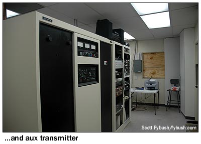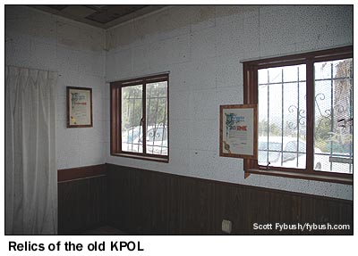 Later, when the studios had moved away, the building was turned into an apartment for engineers, and there are several veteran LA engineers who have called these rooms home over the years. Most recently, it housed the tower crews while they were working on the site last year; because it's a wooden building in an area ravaged by wildfires, the plan is to tear it down eventually and to move the transmitters up the hill, where the towers are. For now, though, the building sits mostly empty (with a few old city plaques honoring KPOL for long-forgotten good deeds gathering dust on the walls), and chief engineer Mike Tosch is happy to show off the slightly newer annex to the building (out of frame to the right in the exterior photo above) that's home to the current main transmitter, a Harris DX50, and to the aux, a DX10. Look closely to the right of the DX50 and you can see one cabinet that's still left from the original 50 kW General Electric transmitter that went in back in the sixties.